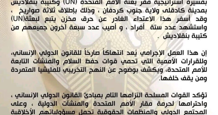 خبر مقتل (7) جنود من قوات حفظ السلام عقب استهداف مسيرة مبنى الأمم المتحدة بمدينة كادوقلي ديسمبر 14, 2025 جنوب كردفان