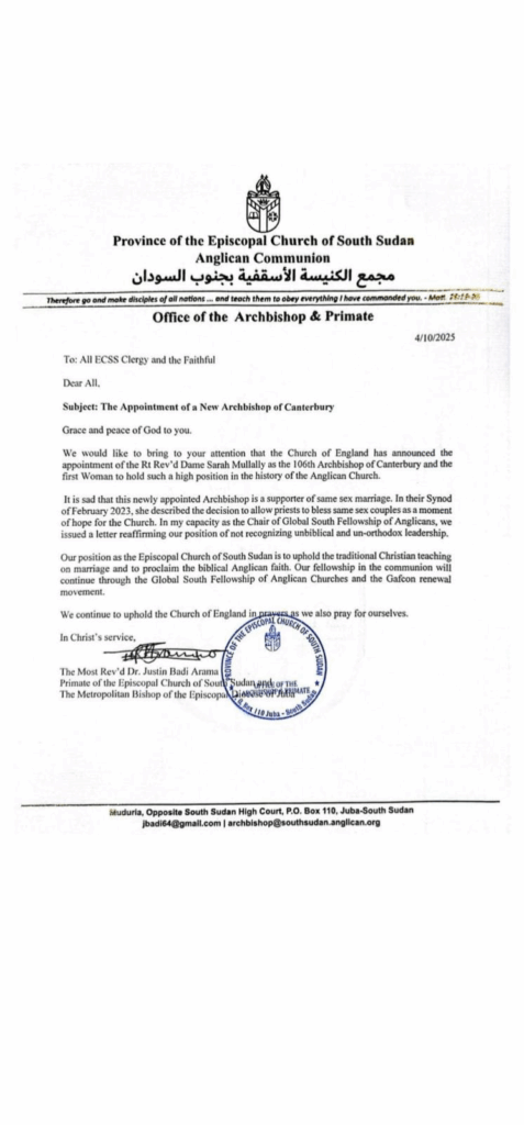 أصدر مجمع الكنيسة الأسقفية في جنوب السودان ECSS بياناً رسمياً يعلن فيه رفضه الاعتراف بـالرئيس الأسقفي الجديد لكانتربري، كما أعلن عن تجميد موقعه داخل شركة الزمالة العالمية لجنوب الكرة الأرضية للأنجليكان Global South Fellowship of Anglicans وعدم التوقيع على أي قرارات مستقبلية له، وذلك على خلفية تعيين المرأة الأولى التي تحمل أعلى منصب في تاريخ الكنيسة الأنجليكانية، والتي “تدعم زواج المثليين”.