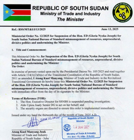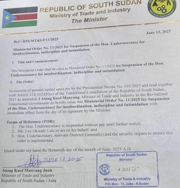 وجاء في الأمر الوزاري “أنا، أتونق كوال منيانق، وزيرة التجارة والصناعة في الحكومة الانتقالية المُنشطة، أُصدر بموجب هذا الأمر الوزاري رقم 11/2025 بإيقاف وكيل الوزارة المُحترم عن العمل؛ بسبب العصيان وعدم الانضباط والترهيب، وذلك اعتبارًا من تاريخ توقيعه 13 يونيو/حزيران”.