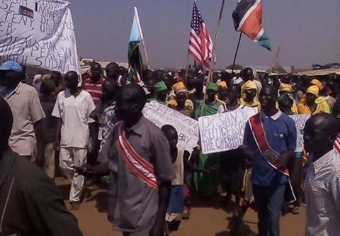 خرج نازحو مخيم بانتيو ، في مسيرة سلمية ، يوم الإثنين ، ترحيباً بتوقيع الأطراف المتحاربة والحكومة بجنوب السودان علي إتفاقية وقف العدائيات الإسبوع الماضي بالعاصمة الإثيوبية أديس ابابا.