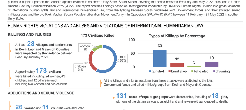 “The report, which covers the period between 11 February and 31 May 2022, is based on 32 verification missions conducted by UNMISS in three counties – Koch, Leer, and Mayendit – and neighboring areas,” the press statement said. “The hostilities in southern Unity State affected at least 28 villages and settlements — with approximately 173 civilians killed, 12 injured, and 37 women and children abducted.”