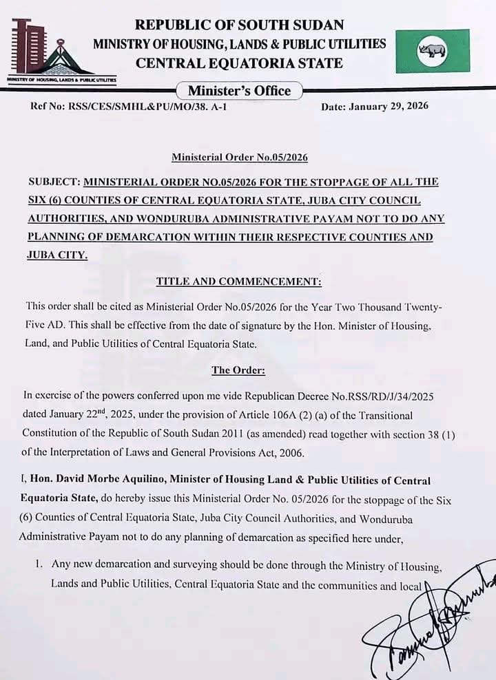 The Central Equatoria State Minister of Housing, Land, and Public Utilities, David Morbe Aquilino, has issued a sweeping directive halting all land demarcation and planning activities across the state with immediate effect.
