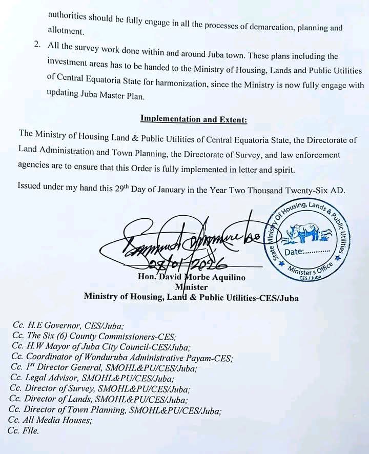 The directive further instructs that all ongoing and previously conducted survey and planning works — including those in key investment zones around Juba — be submitted to the ministry for review and harmonization to ensure alignment with state-wide planning priorities.