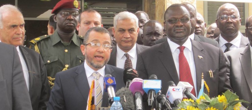 Photo: Egyptian Prime Minister Hesham Qandil speaks during a press conference with South Sudanese Vice President Riek Machar (right) in Juba, 14 March 2013 (Annet Yobu/Juba Post)
