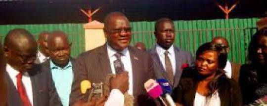 Photo: Ateny Wek Ateny speaks to reporters after receiving SPLM-IO defectors at Juba Airport (Radio Tamazuj)