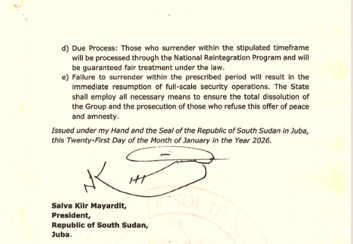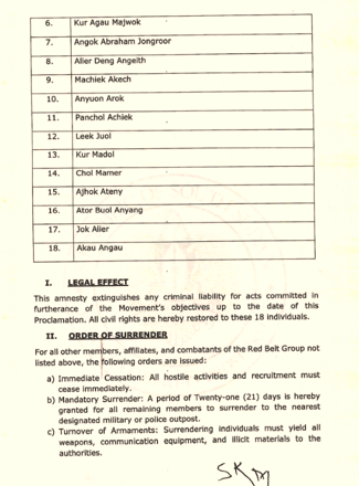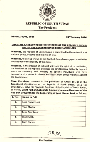 “Whereas, in the interest of national unity and the spirit of reconciliation, the President of the Republic exercises the constitutional authority to grant executive clemency and amnesty to specific individuals who have demonstrated a desire to disarm and desist from armed violence against the Government,” the letter reads in part. “Now, therefore, pursuant to the provisions of Article 101(q) of the Transitional Constitution of the Republic of South Sudan, 2011 (as amended), I, Salva Kiir Mayardit, President of the Republic of South Sudan, do hereby Grant Full and Absolute Amnesty to some Members of the Red Belt Group Under the Leadership of Leek Mamer Leek.”