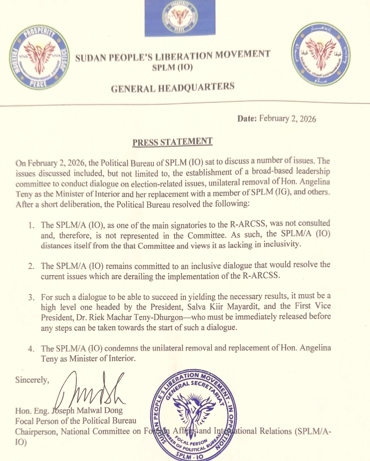 However, the SPLM-IO-Dr. Machar, in a press release extended to Radio Tamazuj on Tuesday, said that on 2 February 2026, its Political Bureau sat to discuss several issues including but not limited to the establishment of a broad-based leadership committee to conduct dialogue on election-related issues, unilateral removal of Hon. Angelina Teny as the Minister of Interior and her replacement with a member of SPLM (IG), and others.