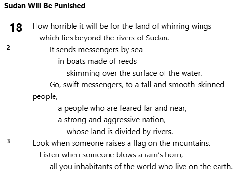 To be honest, I love South Sudan so much, and I would love it if the Bible referenced it. However, concerning this prophecy in Isaiah 18, it is not a reference to South Sudan but the Kingdom of Cush in the 8th century BC, and it was an oracle judgment against it. As a child, I grew up with the same mind, thinking that Isaiah 18 is speaking about South Sudan. I used to hear this interpretation on the radio programs during the early days of our Independence. I used to listen to bishops, pastors, and evangelists preaching and quoting the same passage from time to time that South Sudan is the nation Isaiah 18 foretold, 2,000 years ago.