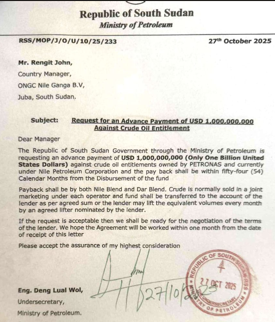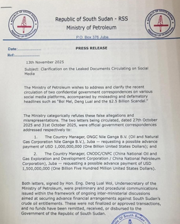 “The Ministry of Petroleum wishes to address and clarify the recent circulation of two confidential government correspondences on various social media platforms, accompanied by misleading and defamatory headlines such as ‘Bol Mel, Deng Lual and the $2.5 Billion Scandal.’ The Ministry categorically refutes these false allegations and misrepresentations,” the statement reads in part. “The two letters being circulated, dated 27th October 2025 and 31st October 2025, were official government correspondences addressed respectively to the Country Manager, ONGC Nile Ganga B.V. (Oll and Natural Gas Corporation Nile Ganga B.V.), Juba – requesting a possible advance payment of USD 1,000,000,000 (One Billion United States Dollars).”