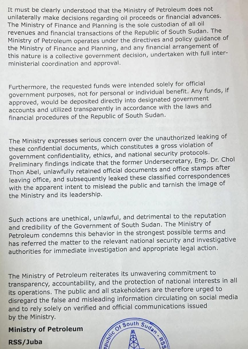 South Sudan’s Ministry of Petroleum on Thursday strongly repudiated that leaked correspondence from the ministry to two international oil companies operating in the country, asking for advance payments to the tune of USD2.5 billion, was an attempt by former Vice President and other officials to embezzle funds, but was a confidential government communication.