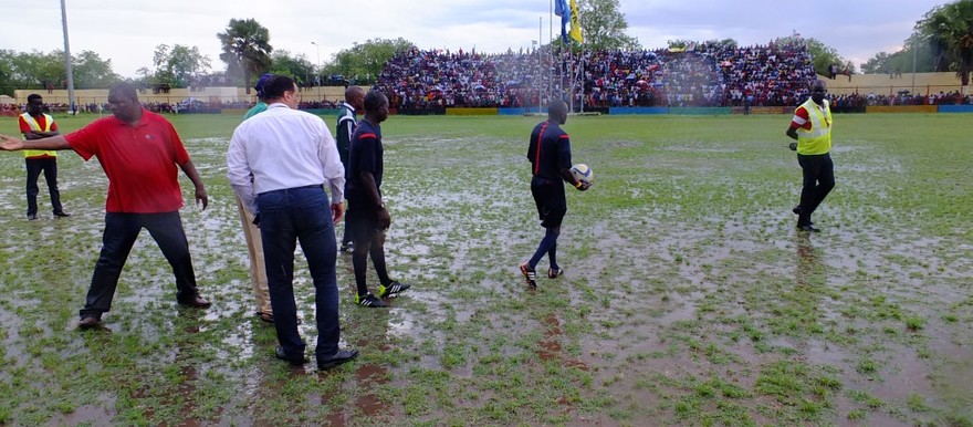 The game was stopped by officials in the first half because of torrential rains in Juba Stadium. Officials provisionally rescheduled the match for 11 a.m. today.