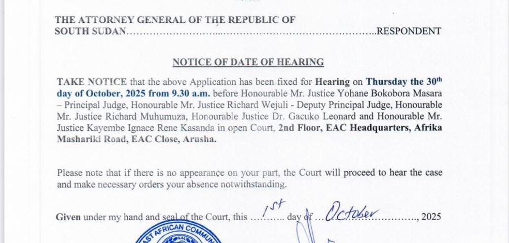 The case, registered as Reference No. 16 of 2025, names South Sudan’s attorney general as the respondent. The Ministry of Justice was served with the court papers in April but did not file a response within the required 45 days, according to the filing.