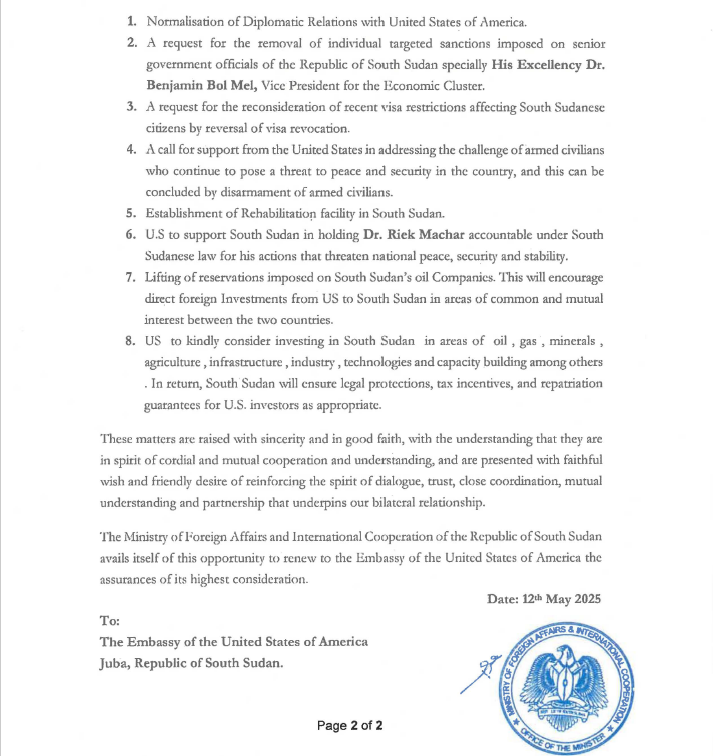 For South Sudan, a communication dated May 12, 2025, and marked confidential, shows the Ministry of Foreign Affairs raised eight “matters of concern which the Government of South Sudan believes merit consideration.” These included easing visa restrictions for South Sudanese nationals, building a rehabilitation centre and “support in addressing the problem of armed civilians”.