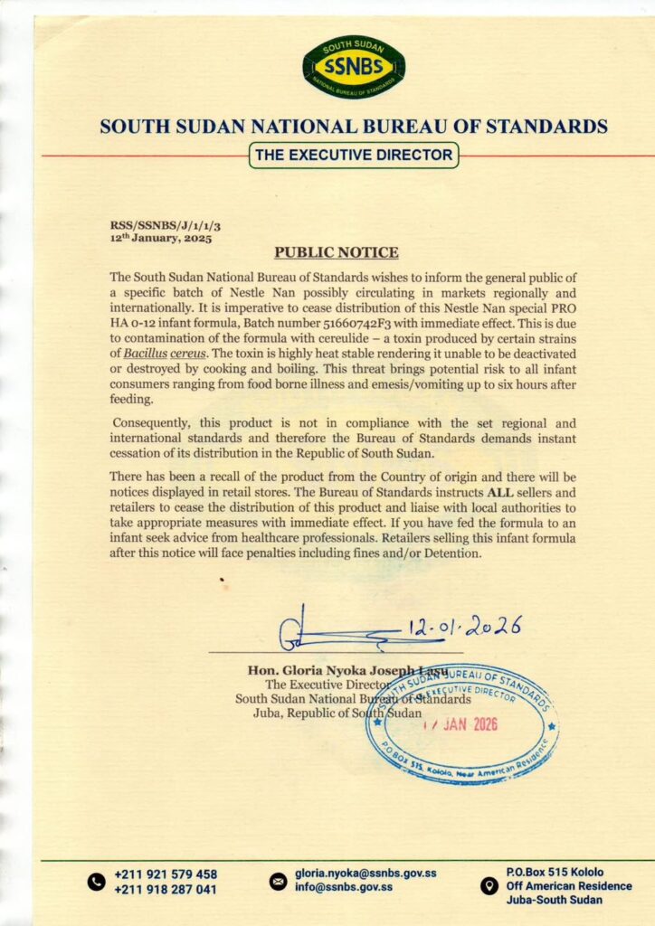The South Sudan National Bureau of Standards (SSNBS) on Monday ordered the immediate cessation of distribution and sale of a specific batch of Nestlé infant formula, warning it is contaminated with a heat-resistant toxin and poses a risk to infants.