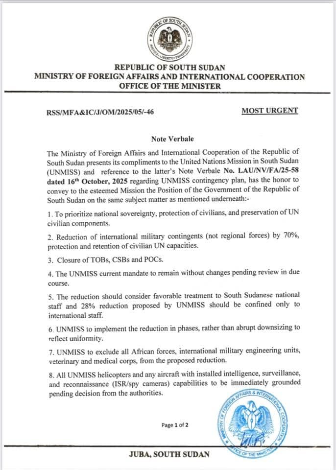 South Sudan’s government has formally demanded that the United Nations Mission in South Sudan (UNMISS) reduce its international military contingents by 70%, ground all aircraft with intelligence-gathering capabilities, and close several military bases and civilian protection sites, according to a diplomatic note obtained by Radio Tamazuj.