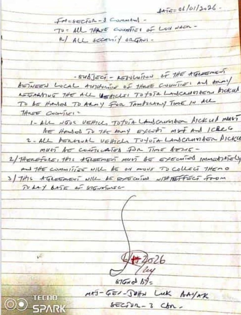 Pal said Gen. John Luk had since established a committee to investigate the origin of the document and determine whether any vehicles had been taken. He said the commander also ordered the return of any humanitarian vehicles if they had been seized.