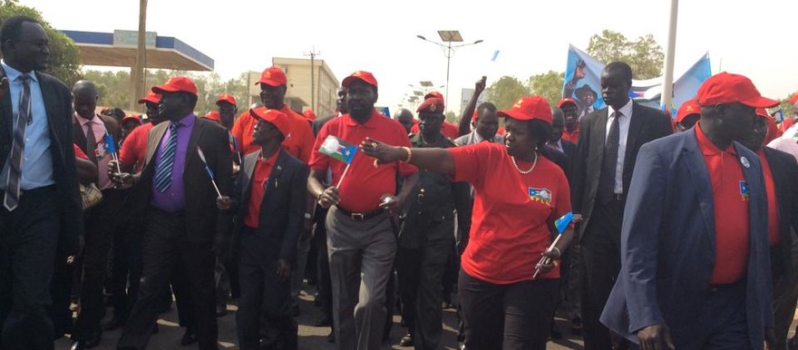 Radio Tamazuj photo: SPLM party chairman Salva Kiir leads party members to a party registration exercise in Juba.