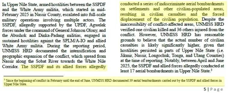 The absence of those airstrikes in the list of indictments, and the absence of the officers who ordered those strikes and carried them out in the ranks of the defendants make it clear that this is a matter which should be referred to a court specifically designed to adjudicate such crimes; it is a role for just such a body as the Hybrid Court for South Sudan is meant to be; or alternatively for a standing body such as the ICC or an ad hoc tribunal such as the International Criminal Tribunals for Rwanda and the former Yugoslavia. Note: those airstrikes are just some of the 39 such aerial bombardments documented by the UNMISS Human Rights Division in the first half of 2025.